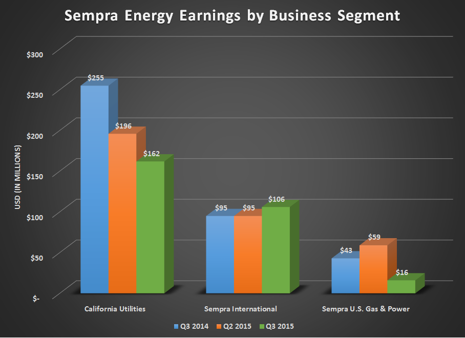 One thing that needs to be kept in mind when looking at these results, though, is that Sempra's earnings are highly seasonal, especially in its Southern California Gas Company. According to management, seasonality had a $113 million earnings impact on SoCalGas. Also, its U.S. Gas & Power was lower year over year mostly because of a $25 million tax benefit it received in the third quarter of 2014.