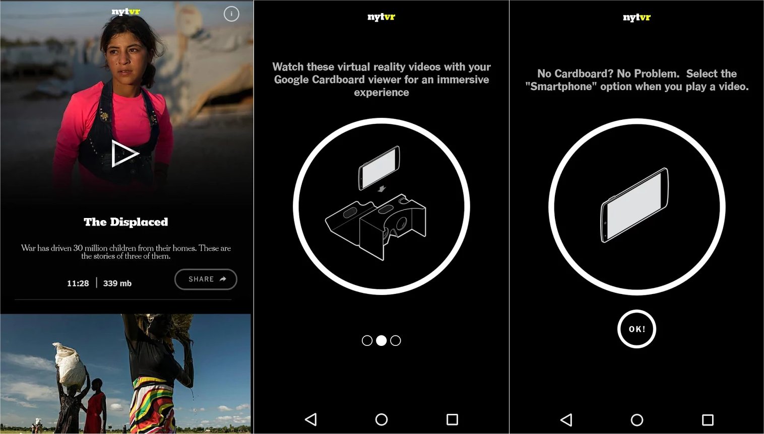 The New York Times (NYT +0.67%) recently handed out Alphabet's (GOOG 1.04%) (GOOGL 1.08%) Google Cardboard VR headset to subscribers of its Sunday print edition. It also launched a companion VR app for iOS and Android, which features VR films that immerse readers in news stories. Its first 10-minute film, The Displaced, follows the lives of three children in a Syrian refugee camp. The second film features the making of Walking New York, a New York Times cover.