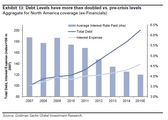 That jump in debt is shown in the following graph, which displays the aggregate debt level (dark blue line) and interest expense (light blue line) for the companies in Goldman's North America coverage universe, indexed to 100 in 2007 (left-hand axis):