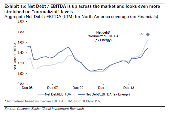 This graph shows the ratio of net debt (i.e., debt minus cash) over EBITDA (earnings before interest, taxes, depreciation, and amortization -- a measure of cashflow) since the end of 2005. That ratio (dark blue line) is back to the highest level achieved during the credit crisis. Once you remove energy companies, the rebound in the "normalized" ratio (light blue line) is even more pronounced.