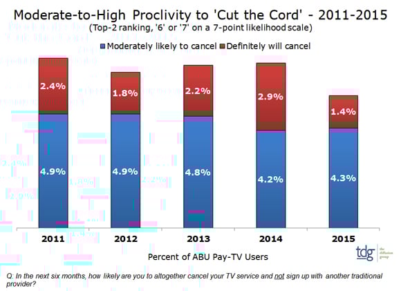 "Cord cutting proclivities have held steady for several years, with approximately 7% of ABU pay-TV subscribers moderately or highly likely to cancel their service in the six months following the survey," said Michael Greeson, TDG Co-founder and Director of Research in a press release. "In early 2015, however, this number declined to 5.7%. This is the first time in five years we've seen significant change."