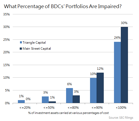 If you think very conservatively and assume that all portfolio companies held at 80% or less are going to zero, you would need to take Triangle Capital's NAV per share down to $13.77 per share (a loss of $1.71 per share) and Main Street Capital's NAV down to $20.72 (a $1.07 loss). That's probably a conservative estimate over the next couple of years, as not all will go to zero, and one would expect some offsetting gains from the handful of winners.