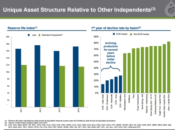 One question that gets raised when an oil and gas producer reduces expenses and capital spending is how much its production down the road will suffer. Compared to many of its peers, Denbury is in much better shape because of its asset base. The mature oil reservoirs that Denbury juices with CO2 to extract the remaining oil have much lower decline rates than both traditional and shale wells.