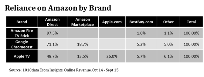 Chromecast and Apple TV are both top-selling devices and if Amazon does not stock them, people are likely to go elsewhere to buy them rather than substituting a Fire device. Dropping the two devices could cost Amazon significant sales over the next year, according to research from 1010 Data: