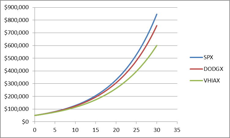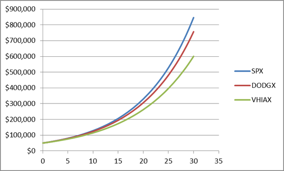 If you invest $50,000 into each of these three funds, take a look at what happens over a 30-year time period.
