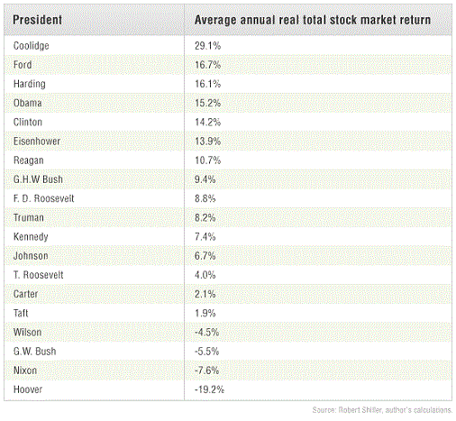 Fellow Fool Morgan Housel did some research on the topic back in 2012. Looking simply at stock market returns, here's the list for how each president since 1900 has stacked up.