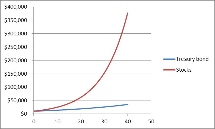 To illustrate why, consider this example. Let's say you have $10,000 to invest. At the MyRA's Treasury bond's average returns over the past 10 years, you could expect your money to grow to about $13,700 over the next decade. However, at the S&P 500's historic average of about 9.5%, your investment could grow to nearly $24,800. The difference is even more dramatic over long periods of time: