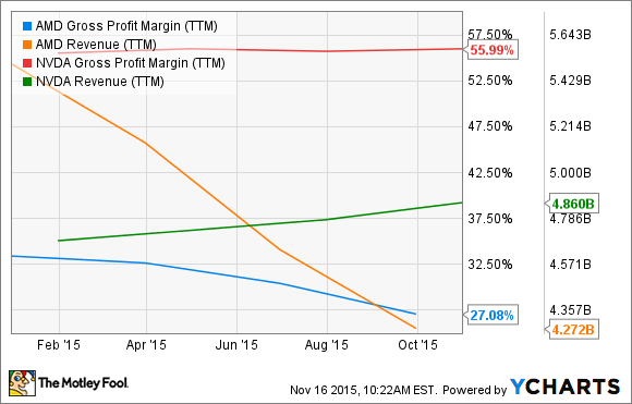 NVIDIA has better margins and greater revenue than AMD does. Source: YCharts.