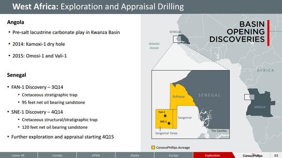Matt DiLallo: Senegal isn't known to be an oil and gas hotbed -- yet. But that could change thanks to ConocoPhillips (COP 1.19%), which made two discoveries in the deepwaters offshore Sengal late last year. The map on the slide below notes the locations of these two discovery wells.