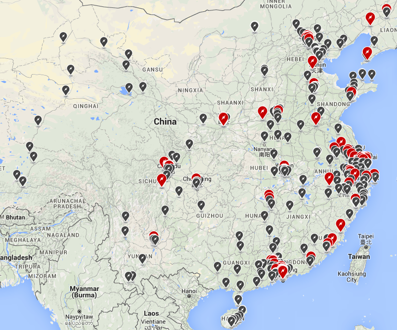 Tesla charging network in China. Dark gray icons indicate Destination Chargers. Red icons indicate Superchargers. Image source: Tesla Motors.