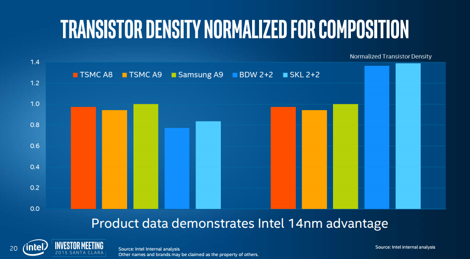 Normalizing for the different compositions of these chips, Intel claims its 14-nanometer technology has a pretty significant edge in terms of density, consistent with the company's published gate pitch/metal pitch metrics: