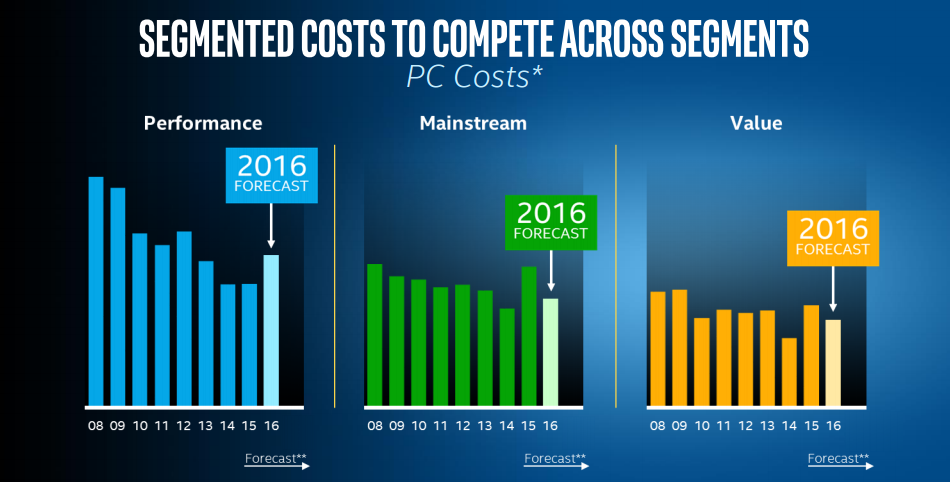 In the mainstream segment, Intel has actually been shipping 14-nanometer products in volume for quite a while, particularly in laptops. This is why we saw a big jump in cost from 2014 to 2015, but as yields improve, costs should come down in 2016. The same phenomenon appears to be in play in the value segment (remember that Intel launched its first "value" 14-nanometer parts in 2015 in the form of Braswell and cut-down Broadwell models).