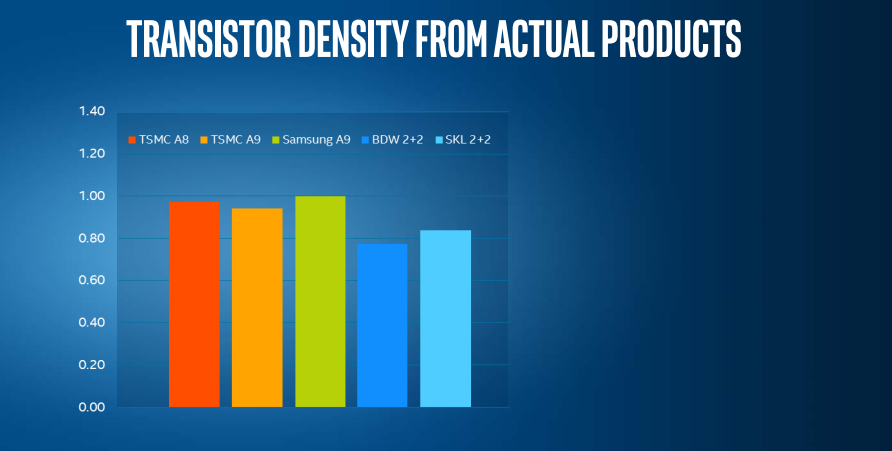 This claim has actually been called into question by a number of folks in the press and the investment community. The doubt arises from the fact that Apple's (AAPL +0.04%) A8 and A9 processors, built on TSMC's 20-nanometer and 14/16-nanometer processes from both foundries, respectively, seem to be able to pack in more transistors into a smaller area than Intel's latest PC processors.