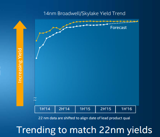 Intel had originally hoped it would be able to get 14-nanometer yields to match the yields of its lead 22-nanometer product by the second half of 2015: