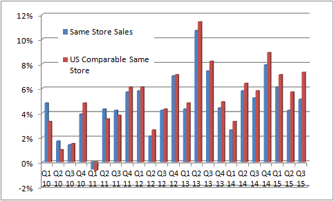 Reported sales increased 6.4% compared to the third quarter of 2014 and diluted EPS came in at $1.35, a 17.4% increase from last year. Comparable-store sales growth was 5.1% and U.S. comparable-store sales growth was 7.3%.
