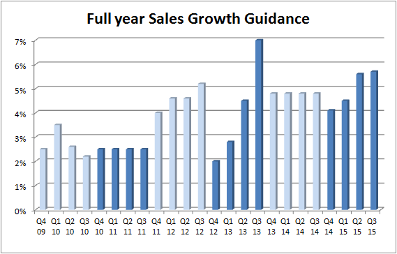 To put the sales and sales guidance into context, here are two charts. As you can see, you have to go back to the third quarter of 2011 to see where total growth outpaced U.S. growth.