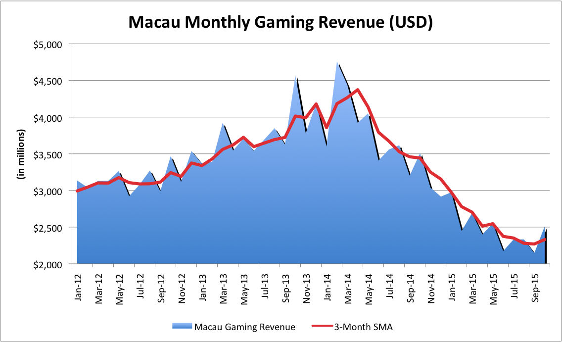 Macau has been in a funk since the middle of last year when a corruption crackdown, frail Chinese economy, and weakness in the junket market combined to keep gamblers out of the region. So far in 2015, gaming revenue is down 35.5% and gaming stocks like Las Vegas Sands (LVS 0.72%), Wynn Resorts (WYNN 4.42%), and Melco Crown (MPEL 1.56%) have all struggled as revenue has fallen.
