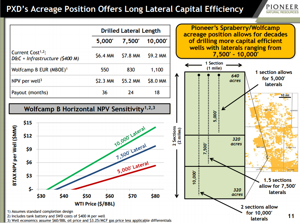 Pioneer Natrual Resources is a great example here. By moving from a 5,000- to a 10,000-foot lateral that Demshur mentioned, Pioneer has improved its net present value for a well by a specacular 247%: