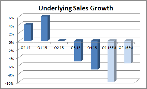 In order to graphically express what he's saying, I've compiled a chart of underlying sales growth. The estimated figures for the first two quarters of 2016 represent the midpoint of the ranges he communicated on the earnings call.