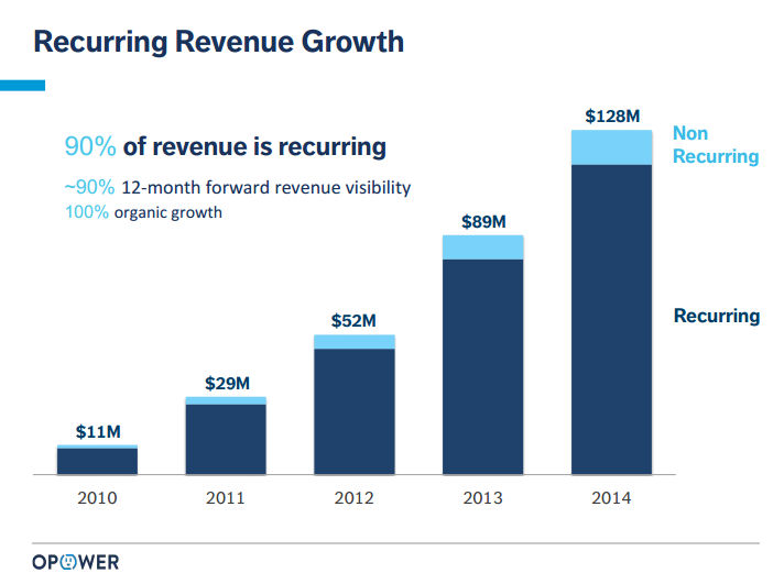 But Opower is losing money today, so it's probably not a good choice for risk-averse investors. However, for more aggressive types, it's worth a deep dive. Once Opower gets a utility to sign on, it has an annuity-like contract in place because it's not easy to switch providers. Putting a number on that, around 90% of Opower's revenues are recurring in nature. The more customers it gets, the more recurring revenue it generates.