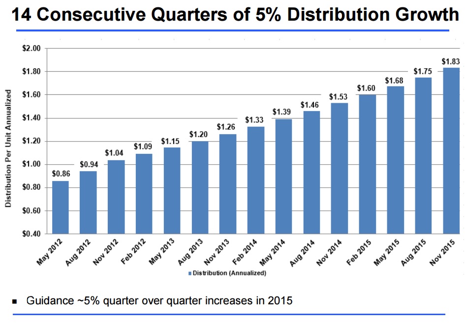However, thanks to four large long-term contracted, fixed-fee midstream projects coming online in 2015, the MLP was able to deliver year-to-date fee-based adjusted EBITDA growth of around 40%, allowing for a large increase in DCF.