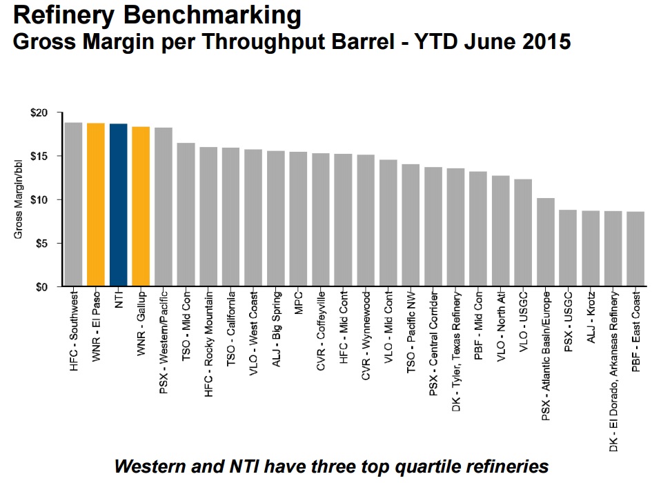 That spectacular result was fueled by low oil prices increasing the refiner's gross margin 32% year over year to $24.97 per barrel excluding a one-time, non-cash charge. That is substantially more than many of Northern Tier's competitors, a result of using cheaper Western Canadian Select crude for some of its inputs.