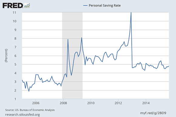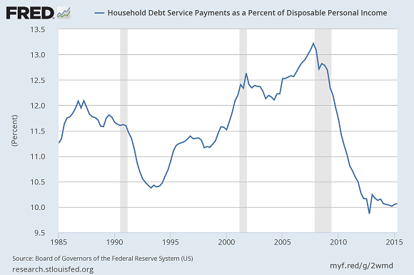While it's still well below historical savings rates, the average savings rate has doubled since before the recession. At the same time, the country has gone through a big deleveraging, and debt payments are now a smaller percentage of household income than at any time in the past 30 years:
