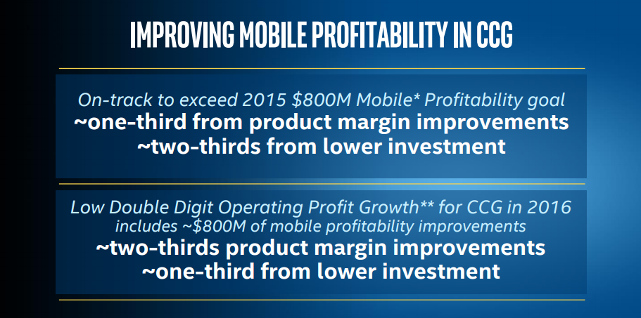 Additionally, the head of the company's Client Computing Group, Kirk Skaugen, said mobile losses in 2016 should come down by $800 million.