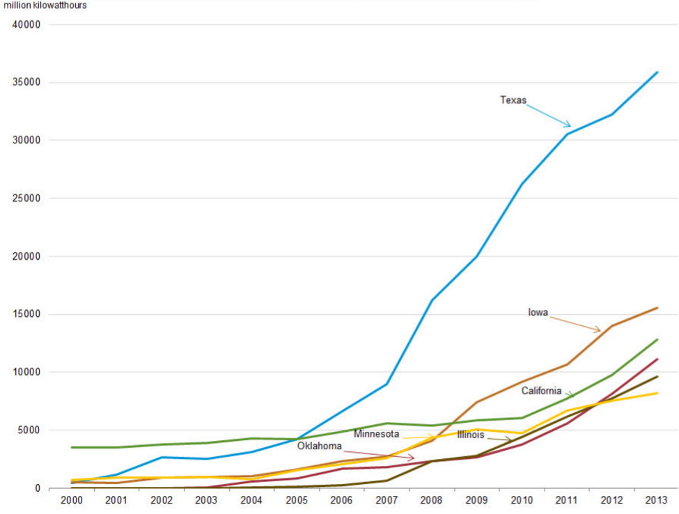 Texas doesn't just have more wind generation capacity than other states, it has more than twice as much. According to new data released from the U.S. Energy Information Administration, Texas's 2013 (most recent data) wind generation blew past 35,000 MWh. In second place, Iowa edged ahead to clock in just over 15,000 MWh's worth of energy, with California in third place at around 13,000 MWh.