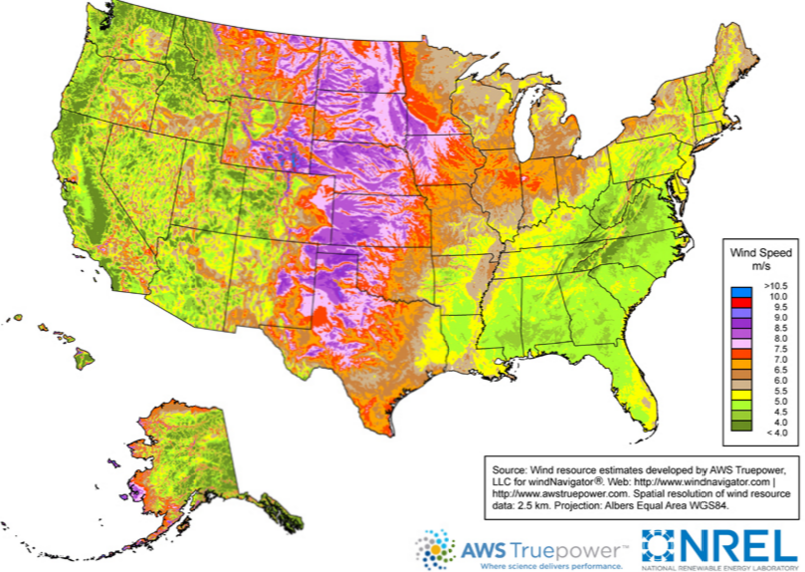 Source: Energy.gov; wind speed (m/s) at 80m above ground level.