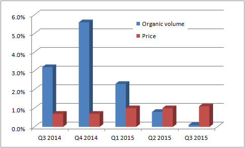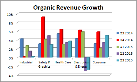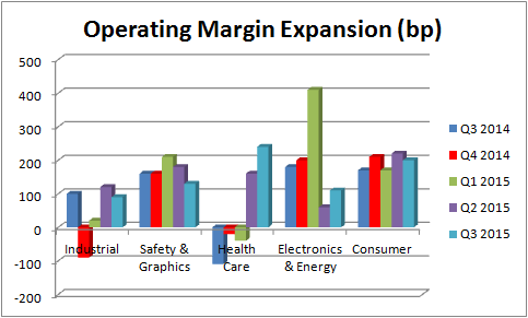 Underlying margin expansion has been impressive in 2015, and 3 out of 5 segments (consumer, healthcare, and safety and graphics) continue to generate good underlying sales growth. Moreover, the ERP rollout and cost savings from restructuring offer some self-help upside to the stock in future years.