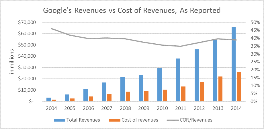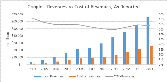 I thought it would be a revealing exercise to net out TAC from both revenues and cost of revenues. For example, Google reported revenues of $66 billion last year and cost of revenues of $26 billion. If we take out $10 billion of TAC from both figures, we have revenues of $56 billion and costs of $16 billion. Note that the TAC figure I've used is only network-member TAC and not distribution TAC, which is a different matter. But more on that later.