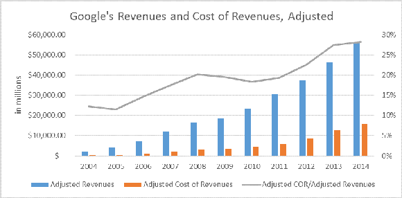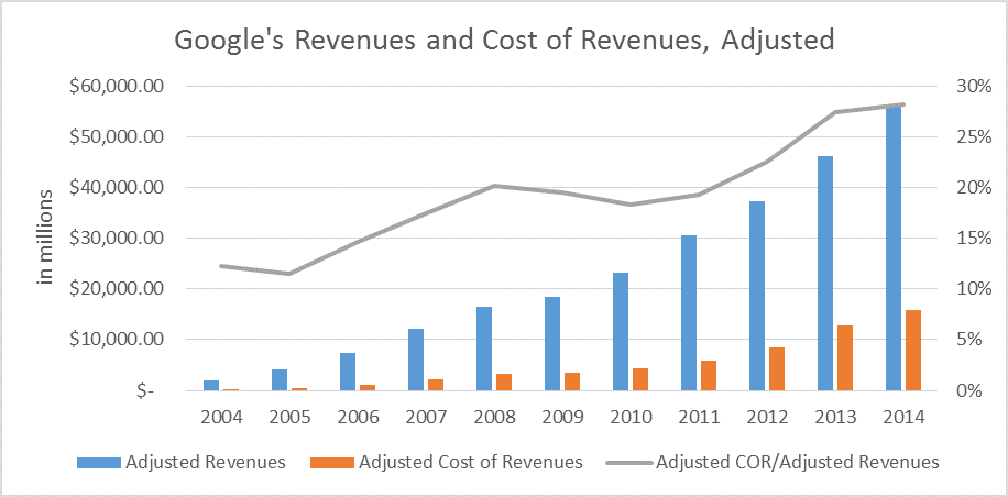 These adjusted numbers give Google's cost of revenues ex-traffic acquisition costs a greater say in the matter and reveal the trajectory of those costs, which have gone up quite steadily by 41%, annualized, over the past three years -- a time when adjusted revenues went up by 19%.