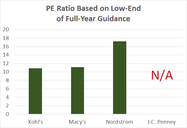 Kohl's has mostly stopped building new stores, but comparable-store sales have now grown for the past four quarters in a row. Earnings per share are increasing, with the low end of Kohl's guidance representing about 4% annual growth. And the stock is the cheapest of all four department-store stocks, trading at less than 11 times the low end of the company's full-year EPS guidance. At that price, Kohl's looks like a great deal.
