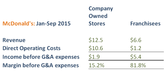 To explain this in terms of margin, the locations McDonald's owns generate a 15.2% operating income margin before any corporate G&A and other expenses are applied. Franchised stores, however, deliver a margin of nearly 82%: