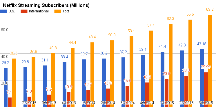 Netflix ended the third quarter of 2015 with a total of 69 million members around the world, 42 million of them in the U.S., and the remaining 26 million in international markets. Growth will probably slow down in the U.S., but international markets should remain powerful growth drivers in the middle term.