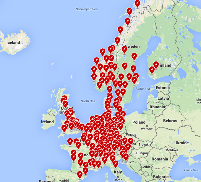 Tesla Supercharger network in Europe makes traveling in the countries where Tesla sells Model S easy. Image source: Tesla Motors.