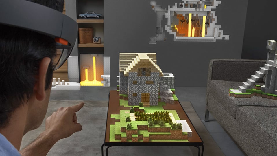 A visualization of the HoloLens being used to play Minecraft. Image source: Microsoft.