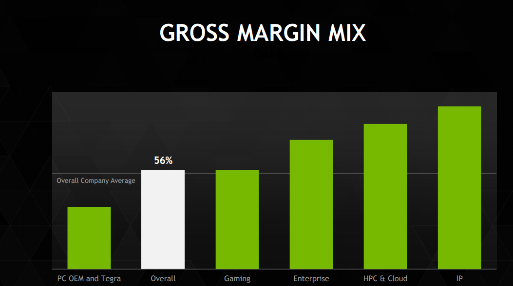 NVIDIA doesn't explicitly break out operating expenses and gross profit margins for this business, but I think a gross profit margin percentage estimate of 35% seems reasonable based on the following chart from the company's last financial analyst day: