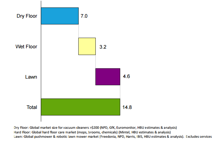Specifically, according to iRobot's calculations, home robots for the lawn represent a roughly $4.6 billion annual market at retail: