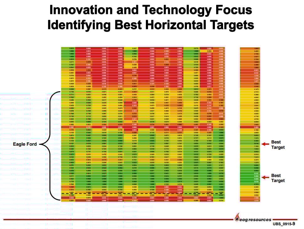 One of the ways it has improved its returns is by using technology and innovation to increase its production. Thomas noted that "the new work we are doing on targeting means that EOG continues to drill the strongest horizontal wells in the industry." By targeting specific sections of a reservoir, EOG is able to hit more of the hydrocarbon sweet spot and therefore extract more oil out of each well. An example is shown on the slide below.
