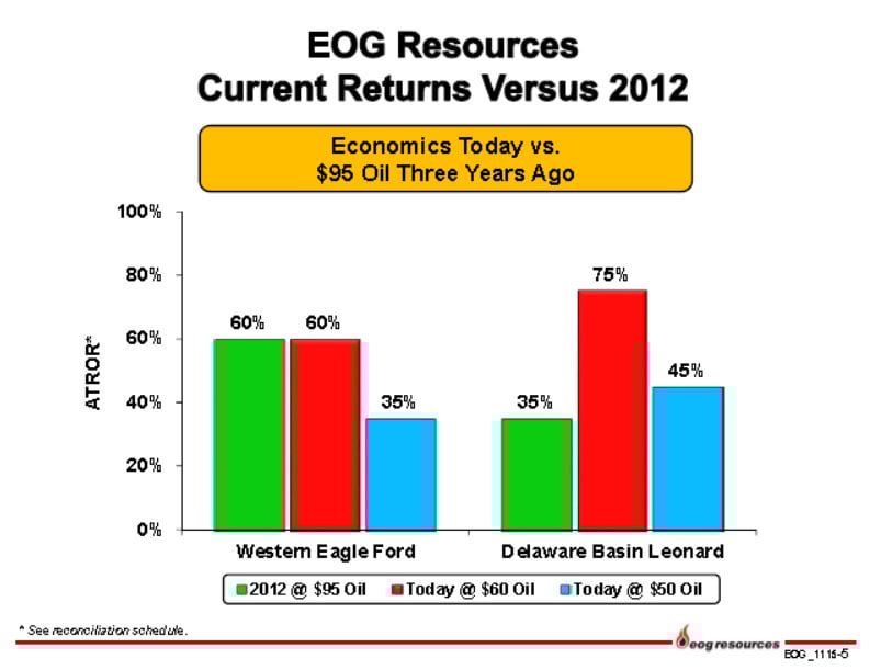 We have maximized return on capital invested by directing capital to our best plays, the Eagle Ford, Bakken and Delaware Basin. We are having a record year of well productivity improvements and cost reductions. ... As a result of these efforts, our largest and best assets now generate over 40% direct after tax rate of return with $50 oil. Making a solid return in horizontal oil at $50 is an excellent achievement.