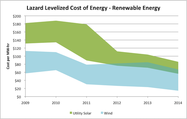 Data from Lazard Levelized Cost of Energy Analysis. Chart by author.