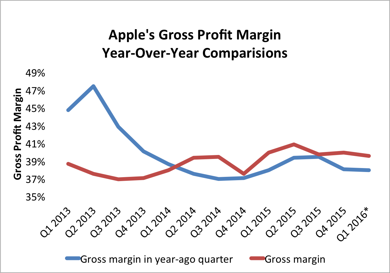 In 2013, Apple's gross profit margin comparisons were downright scary. In fact, Apple's second-quarter gross profit margin in 2013 was around 1,000 basis points lower than in the year-ago quarter.