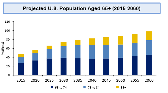 This is due to a combination of catalysts, such as the Affordable Care Act, which has provided accessible healthcare for millions of previously uninsured people, as well as the aging U.S. population. In fact, the 65-and-over population is expected to double by the year 2060, and the 75-plus and 85-plus age groups are projected to grow at an even faster rate.
