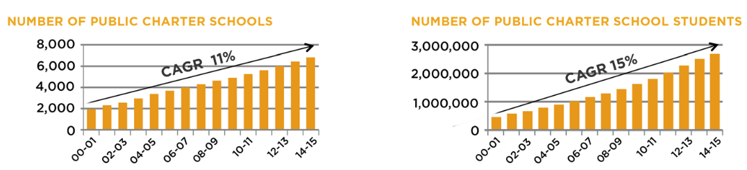 Finally, there are the education properties, which are perhaps the most appealing to long-term investors. Most of its education portfolio consists of 70 public charter schools, and this is an extremely attractive market where demand is growing faster than supply. The number of public charter schools has grown at an average 11% annual rate since 2000, but the number of students has grown even faster.