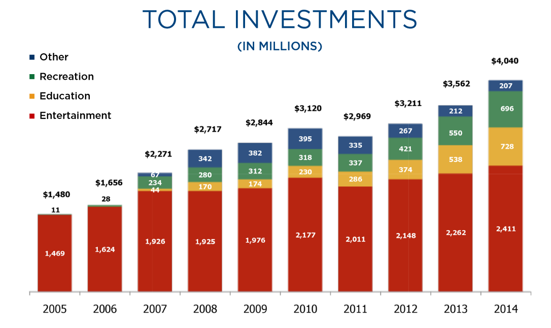 EPR Properties' investment portfolio has grown rapidly, with total investments up by 172% over the past decade alone. The company is showing no signs of slowing down -- in fact, the investment total for 2015 is expected to be EPR's highest yet at $575 million to $625 million, and management expects 2016 to be bigger still.