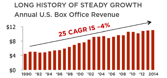 First, the megaplex movie theaters, which make up roughly half of the company's portfolio, are designed specifically to appeal to millennials, a group which represents 50% of moviegoers. With amenities such as premium quality seating and innovative in-theater food and beverage options, these "next generation" theaters are seeing double the customer spending of older ones. Plus, 2015 box office revenues are expected to set a new record.
