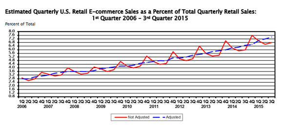 According to the Department of Commerce, e-commerce accounted for only 7.4% of total U.S. retail sales during Q3 2015. It isn't clear what the full extent of retail sales that Amazon will be able to ultimately fulfill is; grocery sales and delivery remain clear sticking points. However, as the company doing the most to reinvent the modern retail supply chain (drones, 1-hour delivery, etc.), it's reasonable to expect Amazon will fight for every percentage of market share it can.
