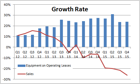 In addition, Deere's equipment on operating leases has significantly increased in the past few years, even while sales have deteriorated. This situation has created a scenario whereby a glut of used equipment could build up and put pressure on used and new machinery prices.